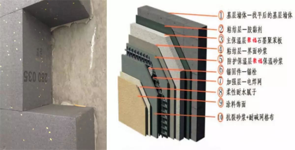 (1)優(yōu)質(zhì)石墨聚苯板產(chǎn)品必須滿足如下要求:一是優(yōu)質(zhì)原料用擠出法工藝生產(chǎn);二是天然鱗片石墨含量在4.5%~5%,導熱系數(shù)低,絕熱性能穩(wěn)定,可保證導熱系數(shù)≤0.032W/(m·K);三是凈容重18~30kg/m³,板材呈銀灰色;四是折斷泡粒斷面20%~30%以上,燃燒性能B1級。
