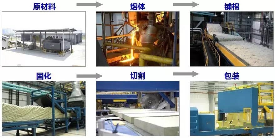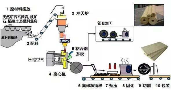 沉降法生產(chǎn)巖棉板是將各類天然巖石通過高溫熔化成液體后再經(jīng)過離心機(jī)吹制成巖棉纖維,然后在沉降室的輸送帶上堆積成巖棉纖維堆,當(dāng)巖棉纖維達(dá)到一定厚度以后,經(jīng)過加壓輥進(jìn)入固化爐與適量粘結(jié)劑、防塵劑、憎水劑等外加劑混合生成巖棉板。