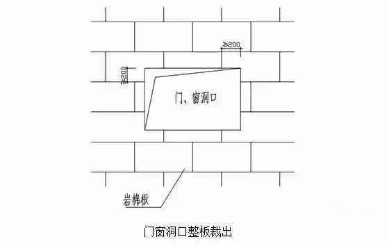 (5)在粘貼窗框四周的陽(yáng)角和外墻陽(yáng)角時(shí),應(yīng)先彈好基準(zhǔn)線,作為控制陽(yáng)角上下垂直的依據(jù)。門(mén)窗洞口四角部位的巖棉板應(yīng)采用整塊巖棉板裁成“L”型進(jìn)行鋪貼,不得拼接。接縫距洞口四周距離應(yīng)不小于200mm。