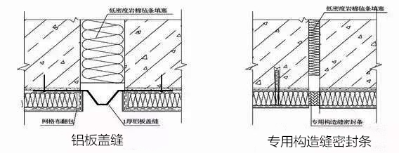 基層墻面結(jié)構(gòu)變形縫包括沉降縫,外保溫系統(tǒng)應(yīng)在變形縫處斷開(kāi),巖棉保溫板在此端口部位應(yīng)粘貼窄幅標(biāo)準(zhǔn)網(wǎng)布進(jìn)行翻包??p內(nèi)設(shè)低密度聚乙烯泡沫塑料作保溫材料,蓋縫板根據(jù)縫寬和位置設(shè)置金屬蓋板(一般采用1.2mm 鋁合金板或 0.8mm 鍍鋅鋼板),以射釘或螺絲緊固。 如下圖所示: