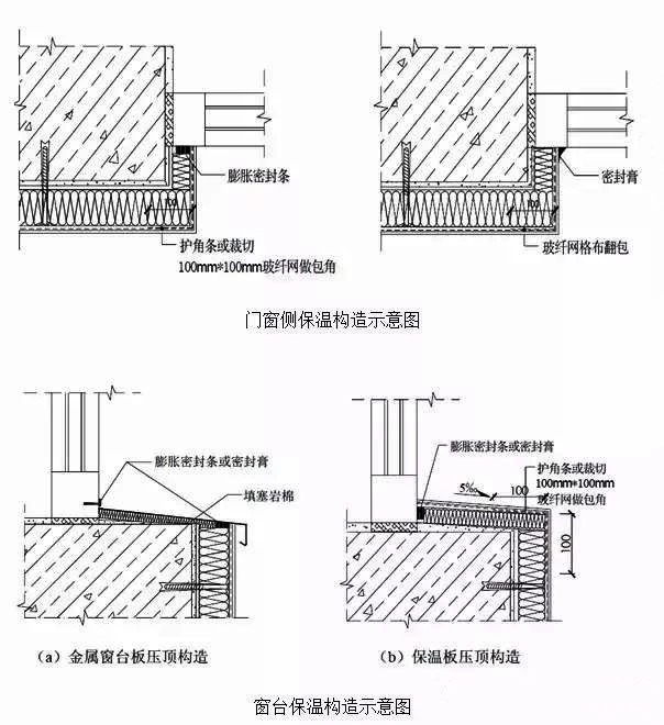 (6)巖棉板在窗口側(cè)邊的端口可采用網(wǎng)布預(yù)埋翻包,并砂漿抹實(shí),下一道工序抹面增強(qiáng)層施工時(shí)大面網(wǎng)布應(yīng)折邊至窗框側(cè)邊,保溫層與門(mén)窗框的接口處縫口用密封膠嵌實(shí)。
