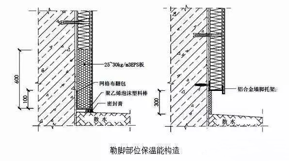 散水坡以上不小于150mm 部位設(shè)置金屬托架,采用膨脹螺栓間距 600mm 將其固定在墻面上,金屬托架以下即勒腳部位保溫材料采用燃燒性能不低于 B1 級(jí)的高密度聚苯板,其高度為600mm,金屬托架之上粘貼巖棉板。