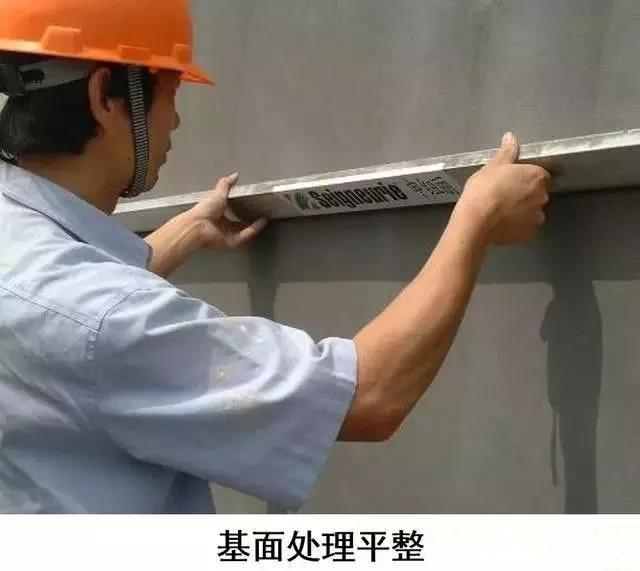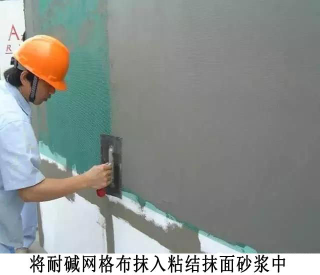 2、將整個墻面使用粘結抹面砂漿進行滿批打底。 3、在粘結抹面砂漿沒有凝固之前將耐堿網(wǎng)格布抹入粘結抹面砂漿中