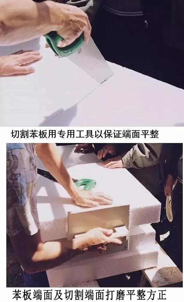6、打磨:在苯板鋪貼完畢后,間隔24小時進行打磨。 用美工刀割去凸出于墻面部分,然后用打磨板磨去板縫處的不平整;使用2米以上靠尺進行檢查,使整個保溫墻面的平整度不超過4mm/2m。打磨時散落的聚苯板屑應隨時用刷子、掃把或壓縮空氣清理干凈。