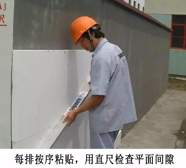 (4)粘貼應盡量擺正位置,若有所偏差可滑動就位,粘貼應輕柔,用工具拍壓緊貼墻面(嚴禁用手拍擊),并使用2米以上靠尺來測量,確保平整,保溫板粘貼應該盡可能靠緊,接縫盡可能小。