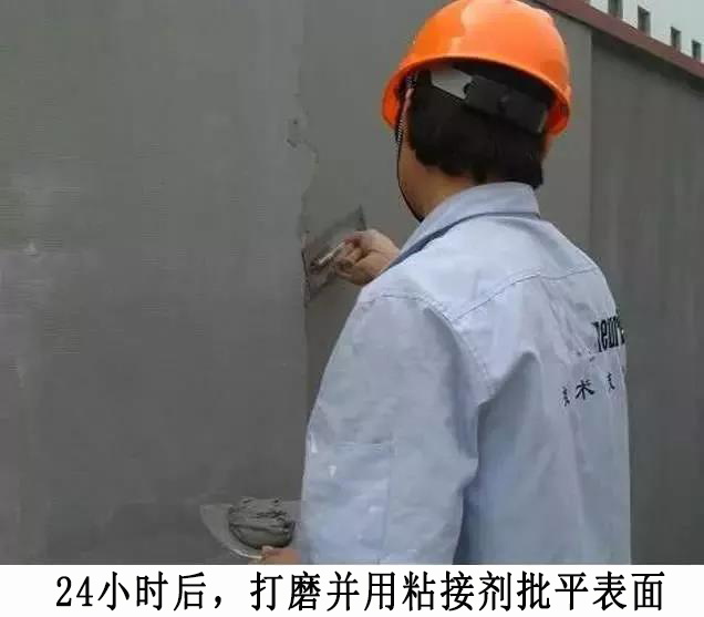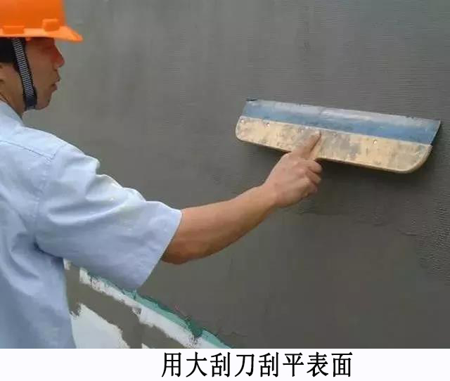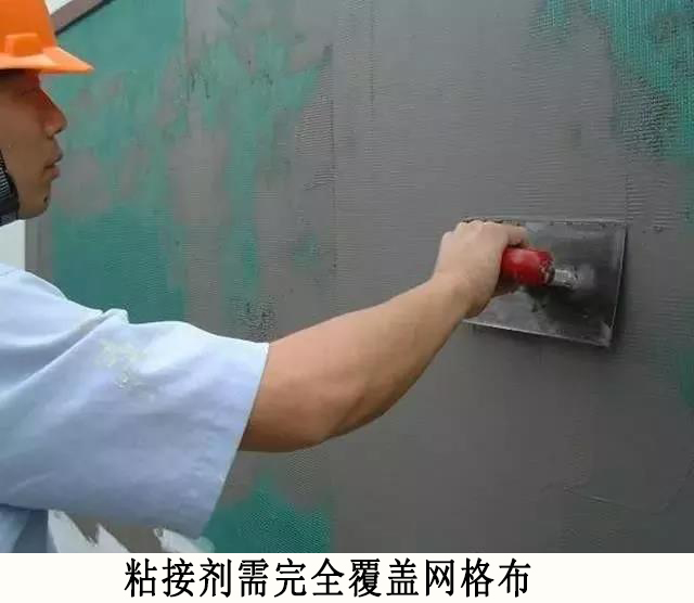 4、粘結抹面砂漿應充分的把網(wǎng)格布包裹,但網(wǎng)格布應盡量靠近加固層的表面約2/3處。具體以看不見網(wǎng)格布顏色而看得見網(wǎng)格布格子的標準來控制施工質量(意思就是網(wǎng)格布外層的粘接劑越少越好,壓入網(wǎng)格布或外層的粘接劑上完后用2米刮刀在外表面刮平整既可)。此工序強調(diào)相互配合,一氣呵成。