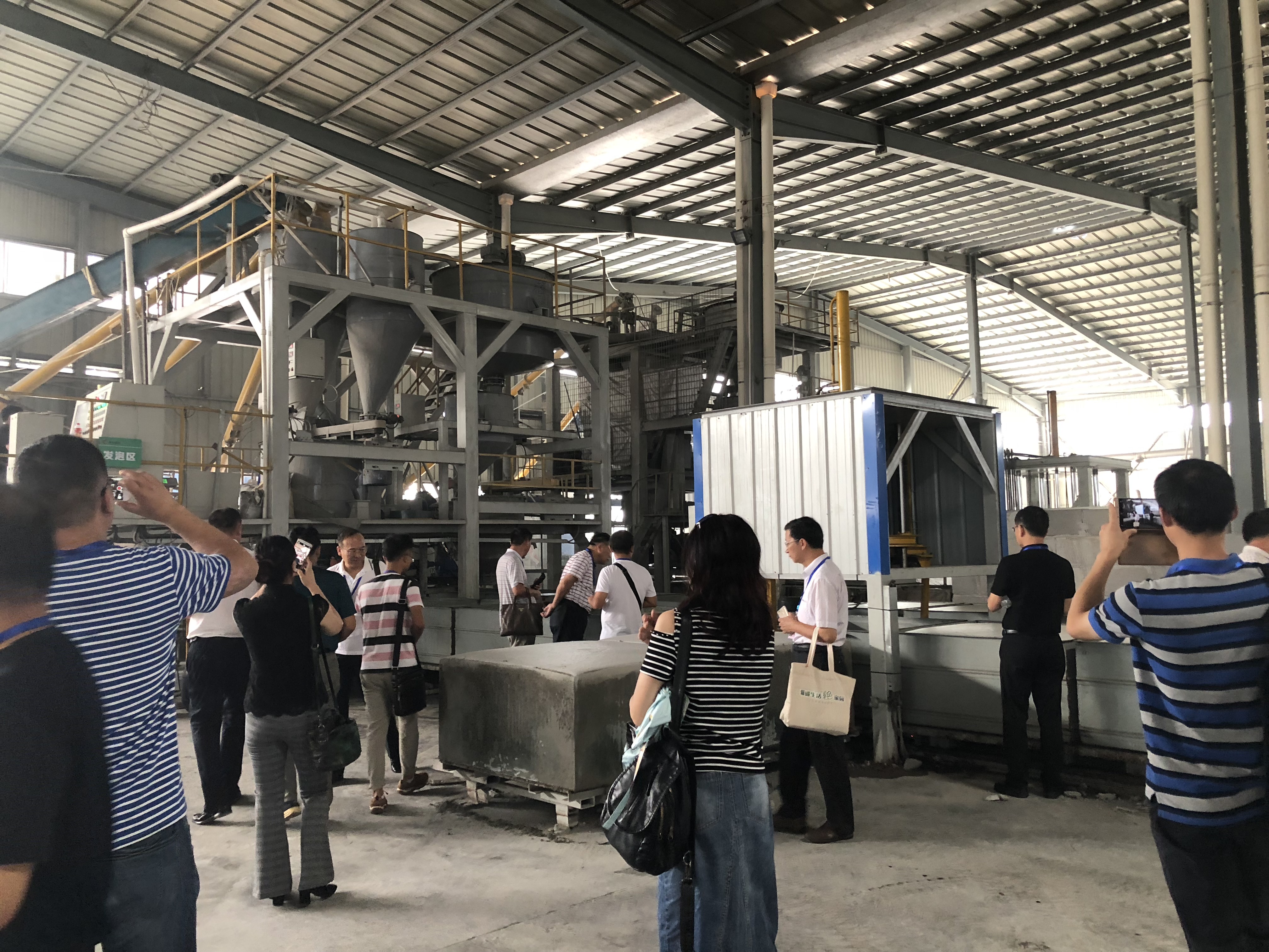 車(chē)隊(duì)到達(dá)之后,由我們朝欽領(lǐng)隊(duì)帶著各位專(zhuān)家領(lǐng)導(dǎo)分別參觀了泡沫混凝土自保溫砌塊、CQ免拆復(fù)合保溫板、以及CS 石墨改性水泥基復(fù)合保溫材料等產(chǎn)品的生產(chǎn)線。