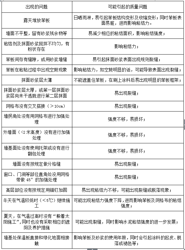 由于國內(nèi)各地方氣候條件的差異,加之施工人員素質(zhì)參差不齊,如果再加上施工現(xiàn)場管理不善,則極易出現(xiàn)這樣那樣的施工問題,進而影響外保溫系統(tǒng)的工程質(zhì)量,現(xiàn)將施工現(xiàn)場幾種常見的施工問題列于下表,僅供參考。