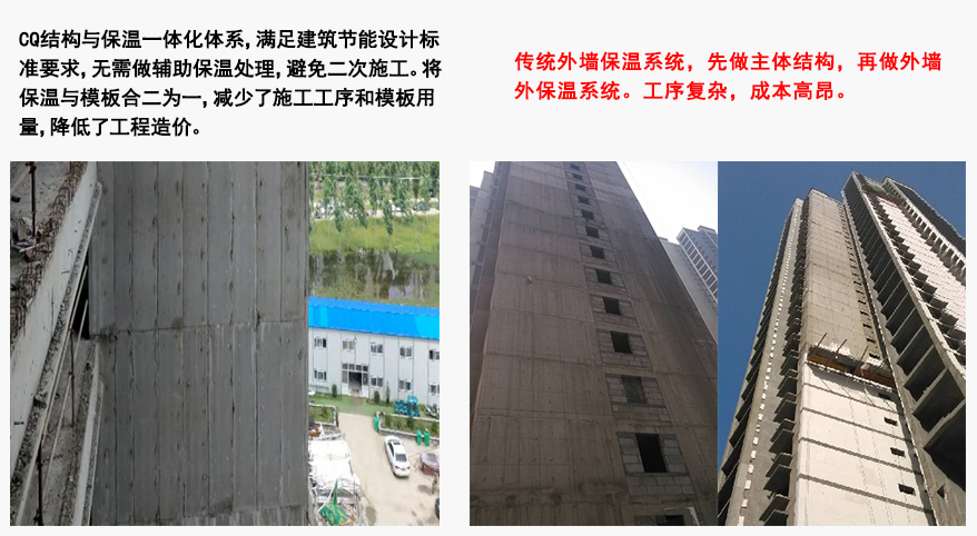 由朝欽公司提出的CQ免拆模板體系很好的解決了目前建筑能源消耗過大,污染嚴(yán)重的問題,先比于傳統(tǒng)的保溫建材,它具有更加節(jié)能,質(zhì)量安全可靠、與建筑同壽命等優(yōu)點(diǎn)。